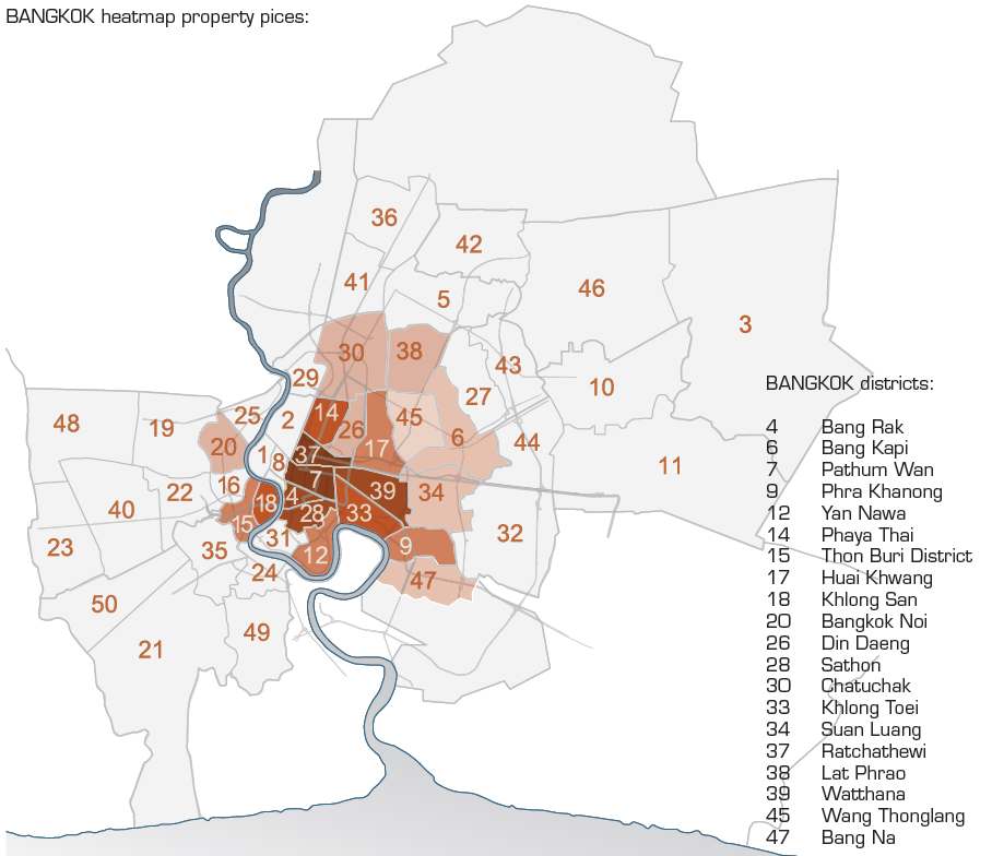 “ロケーションの良し悪しは不動産価格に影響する最大要素の一つである。しかし、エリア別のマクロなロケーションだけでなく、狭いミクロなロケーションの違いでも価格に大きな影響を与えている。例えば、BTSやMRTの駅から500メートル以内の物件であれば、それより遠い物件より40-60%も価格が高い。”