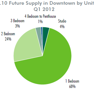 2012年時点でCBREが調査した、将来のミッドタウンでのコンドミニアム供給予測の内訳がこのグラフです。1ベッドルームのシェアが75%、そしてスタジオタイプも合わせると、何と87%にもなります。