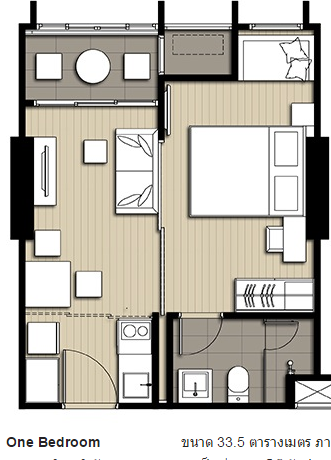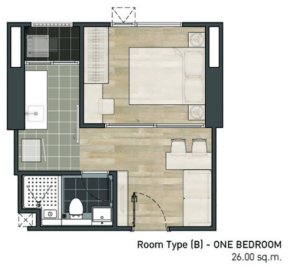 しかも、日本と違って、タイのコンドミニアムは専有面積の計算にバルコニーも含みます。従って、こういう小さなユニットでも普通1.5平米程度のバルコニーが付いているので、実際の専有面積は20平米以下ということになります。
