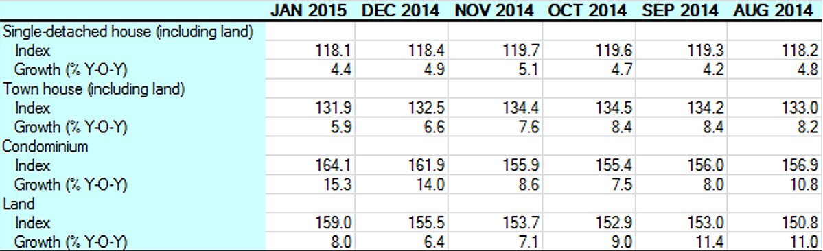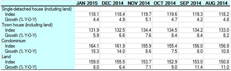 同銀行が作成するハウスプライス・インデックスによれば、各セクターの前年同月比の価格変動は、一戸建てが4.4%の上昇、タウンハウスは5.9%の上昇、土地は8%の上昇、そして、コンドミニアムはなんと15.3%の上昇という結果です。