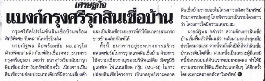昨日のM2Fという現地のフリーペーパーに目を通していたら、三菱UFJフィナンシャルグループが買収したアユタヤのグルンシー銀行が住宅ローン事業に再参入するという記事が目に止まりました。