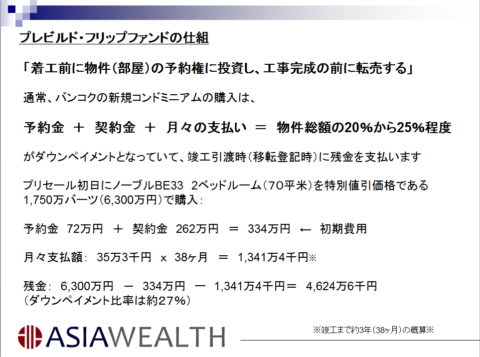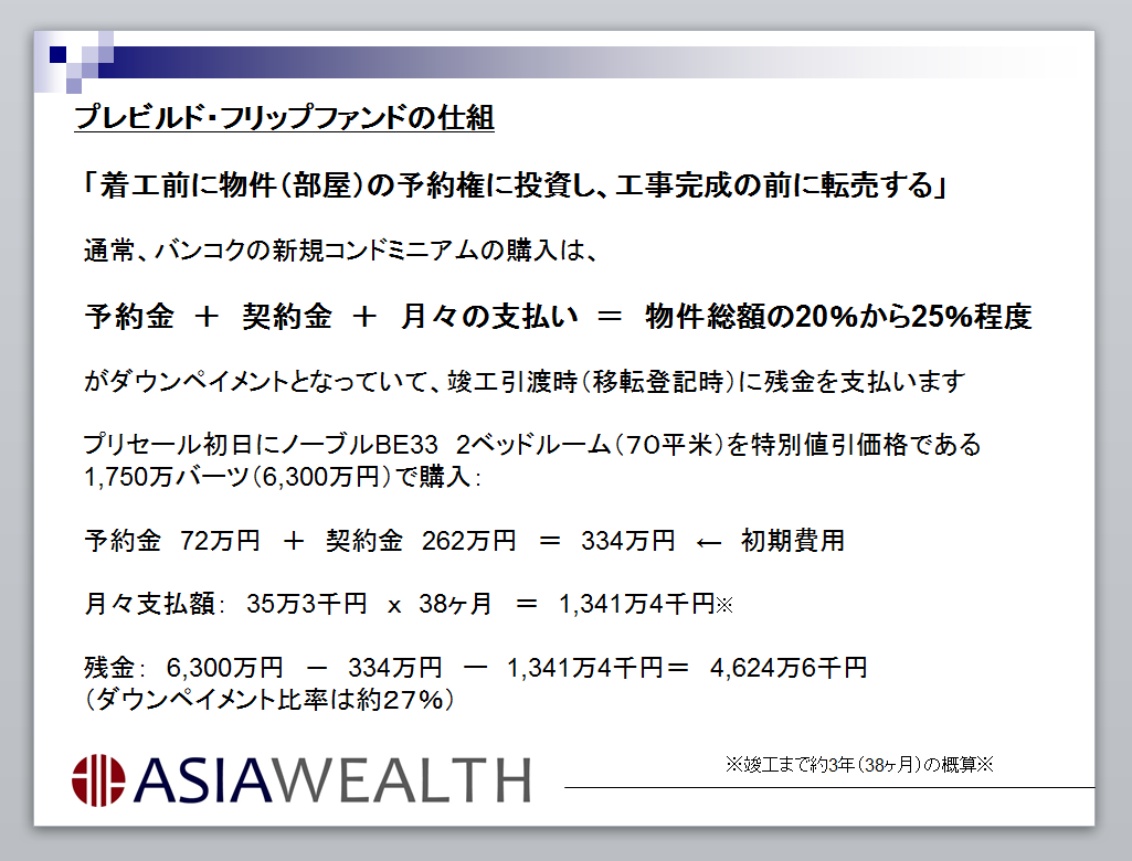 一般的に、プレビルド物件を最初のプリセールで購入した場合、竣工までのダウンペイメントは普通、物件価格の20から25%と言われています。しかし、これを15%以下に下げる、もしくは最初のカー・ジョーング(手付金)とカー・サンヤー(契約金)を数万バーツに下げることで買い易くし、購入層を広げるのです。
