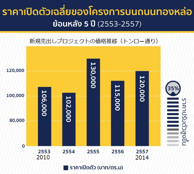 実際に、5年前に売出された新規プロジェクトの平均価格を調べると、BTSトンロー駅周辺物件は平米10万5千バーツ(120万円/坪)であったが、2–3年前に売出された新規プロジェクトの平均価格は、既に35%上昇し平米14万バーツ(160万円/坪)に達していた。