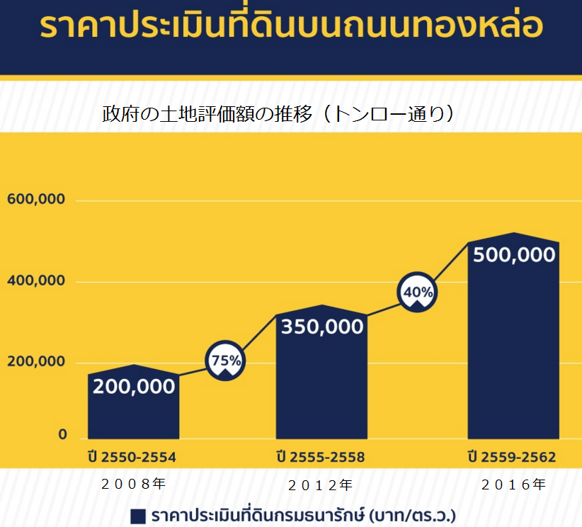 4年前の前回土地評価額見直し時は、トンローの平均地価は1ワー当り35万バーツであった。そして、その更に4年前の見直し時の地価が平均20万バーツであったので、前回の見直し時には75%の上昇であった。そして、今回は40%上昇して45万から50万バーツになると予想される。