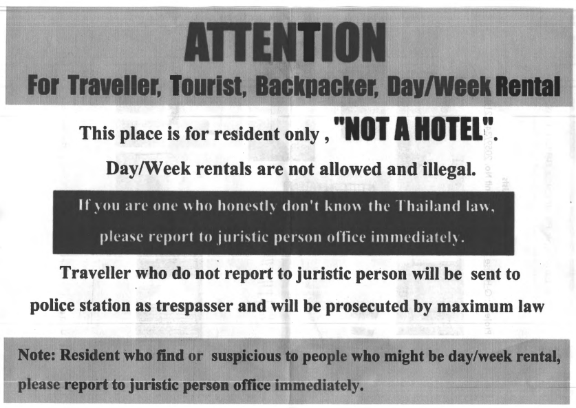 タイの法律では日割/週割でのコンドミニアムの短期貸し出しは禁止されており、これは違法行為です。